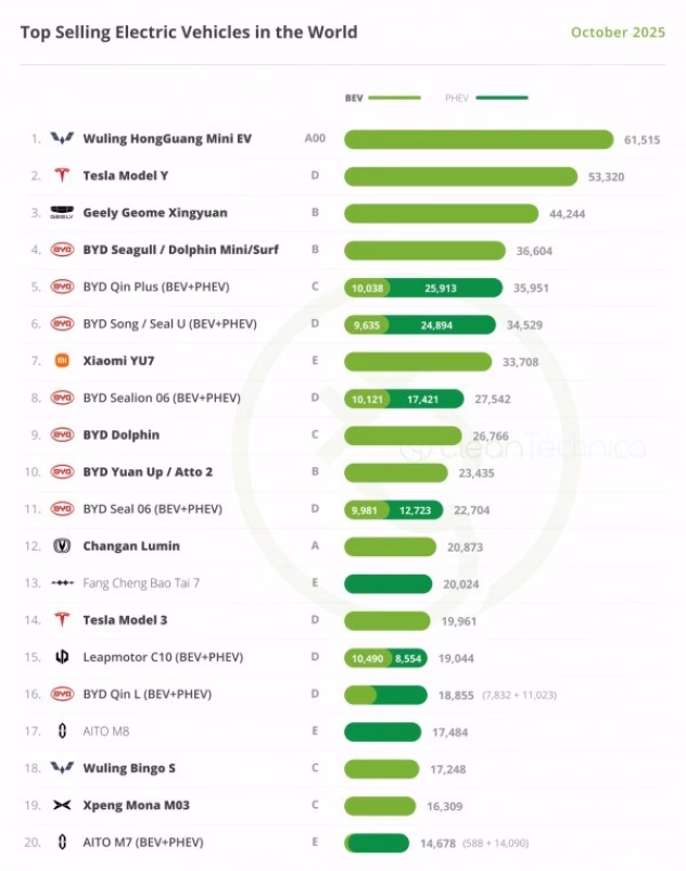2025 metų spalį pasaulinė įkraunamų automobilių rinka parodė, kad dydis ir garsus vardas ne visada garantuoja pergalę. Pardavimai augo apie dešimt procentų, o registracijų skaičius viršijo 1,9 mln. vienetų. Pirmą vietą netikėtai užėmė mažytis kinų „mikro“ automobilis.
