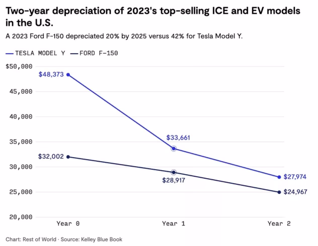 JAV atsiranda tas pats modelis. Pagal perpardavimo stebėjimo duomenis, 2023 m. naujai įsigytas „Tesla Model Y“ dabar yra vertas maždaug 42 proc. mažiau nei jo pardavimo kaina. Per tą patį laikotarpį „Ford F-150“ prarado tik apie 20 proc. savo vertės. Jungtinės Karalystės ir Pietų Korėjos tyrimai rodo panašią tendenciją: trejų metų senumo elektriniai automobiliai praranda daugiau nei pusę savo vertės – tai gerokai daugiau nei to paties amžiaus tradiciniai automobiliai.