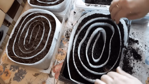 Kai pagrindas paruoštas, galima pereiti prie užpildymo substratu. Žemę berkite įprastu būdu, be skubėjimo, kad neužardytumėte skyrelių. Jei norite, juostos kraštą galite papildomai pritvirtinti lipnia juostele, kad „sraigė“ visiškai nesiskleistų.