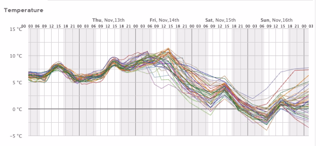 Pateiktame „meteologix“ grafike matyti keliolikos orų modelių temperatūros prognozės Kaunui. Kiekviena spalvota linija žymi atskirą meteorologinį modelį, o jų susiliejimas rodo prognozės patikimumą. Kaip galima pastebėti, beveik visos kreivės sutaria – po lapkričio 15-osios laukia aiškus temperatūros kritimas.