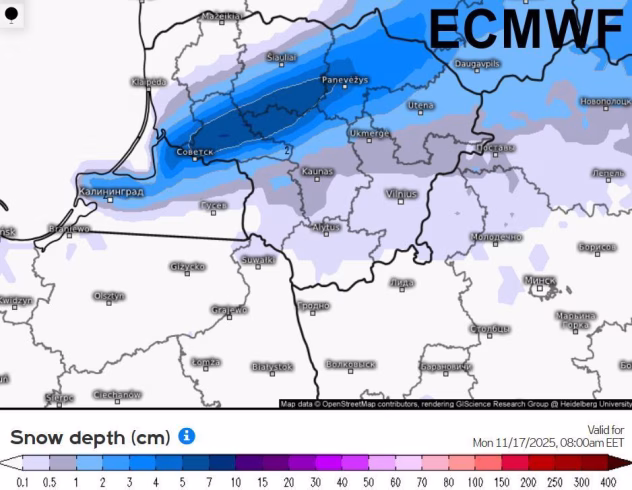 Žemėlapyje pavaizduotas Europos vidutinės trukmės orų prognozių centro (ECMWF) modelis, kuris rodo prognozuojamą sniego dangos storį 2025 m. lapkričio 17 dienos, 8 valandą ryto Lietuvos laiku.