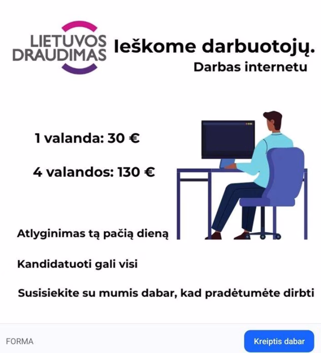 Ieškodami naujų būdų, kaip patekti į gyventojų sąskaitas ir išvilioti pinigų, sukčiai apsimeta realiomis verslo bendrovėmis ir jų vardu siūlo dirbti nuotoliu. Pastaruoju metu socialiniuose tinkluose fiksuojama informacija, neva didžiausias šalies draudikas „Lietuvos draudimas“ siūlo darbą internetu, mokėdamas valandinius įkainius. Bendrovė atsiriboja nuo tokių pasiūlymų ir perspėja gyventojus neapsigauti – nepildyti jokių įsidarbinimo anketų ir nesuteikti asmeninės informacijos.