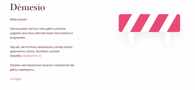 Papildomai pranešama, kad dėl techninių nesklandumų sutrikęs ir klientų aptarnavimo centras – tai reiškia, kad kai kurie klientai negali prisiskambinti ar sulaukti atsakymų į užklausas. Pats bankas informavo, kad esant būtinybei, galima rašyti el. paštu info@luminor.lt.