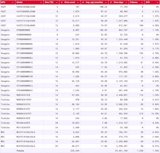 Mažiausiai patikimi diskai buvo „Seagate ST10000NM0086“ (10 TB) su 7,97 % AFR, „Seagate ST14000NM0138“ (14 TB) su 6,86 % ir „Toshiba MG08ACA16TEY“ (16 TB) su 16,95 %. Pastarojo modelio nenormalus našumas paaiškėjo dėl to, kad „Backblaze“ atnaujino šių diskų programinę-aparatinę įrangą, dėl ko jie pateko tarp sugedusių. Tačiau mažai tikėtina, kad tai įvyks einamąjį ketvirtį, ir jų statistika turėtų pagerėti.