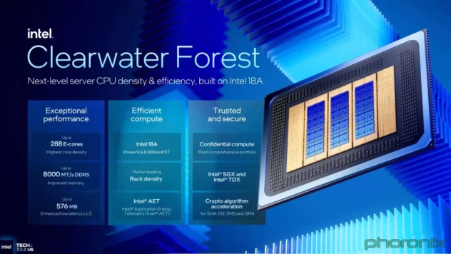 „Intel“ pristatė pažangų 18A puslaidininkių technologinį procesą (18 angstremų arba 1,8 nm) ir paskelbė apie jo pagrindu kuriamus ne tik mobiliuosius vartotojiškus „Core Ultra 3“ serijos procesorius („Panther Lake“), bet ir serverinius „Xeon 6+“ procesorius (kodinis pavadinimas „Clearwater Forest“), pagrįstus energiją taupančiais branduoliais.