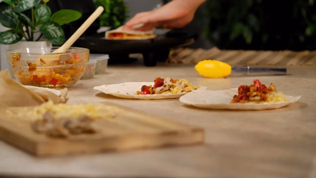 Juosteles dėk į tortilijas, pridėk daržovių ir mėgstamo padažo. Tokio kebabo skonis primena gatvės maistą, bet pagamintas namuose jis dar malonesnis. Ir svarbiausia, viskas užtrunka apie pusvalandį.