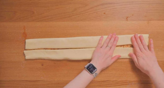 Tešlos lakštą išvyniokite ir šiek tiek pakočiokite, kad būtų lygus. Supjaustykite jį išilgai į 2–3 juostas, tada kiekvieną jų padalinkite į trikampius. Idealu, jeigu iš vieno lakšto gausite apie 6-7 vienodus trikampius.