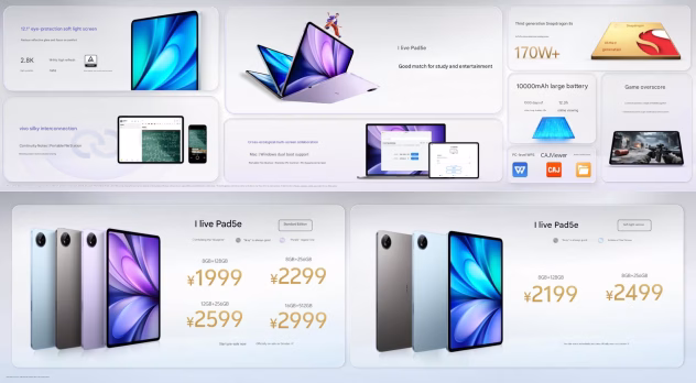 Bendrovės atstovai paskelbė ir apie naująjį „Vivo Pad 5e“ planšetinį kompiuterį, kuris priskiriamas vidutinei klasei. Įdomu tai, jog šis įrenginys pasižymi labai panašiomis savybėmis kaip praėjusį metų rugpjūtį išleistas „Pad3“ modelis.