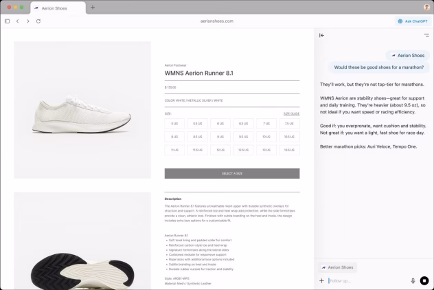 „Atlas“ iš karto išsiskiria tuo, kad turi įdiegtą „ChatGPT“ sistemą, todėl vartotojui nebereikia jungtis prie atskiros svetainės ar programos. Visa sąveika su dirbtiniu intelektu vyksta tiesiogiai naršyklėje, o tai suteikia greitį, patogumą ir vientisą darbo eigą. Ši integracija reiškia, kad pokalbis su DI gali vykti bet kurioje svetainėje, neišeinant iš puslapio.